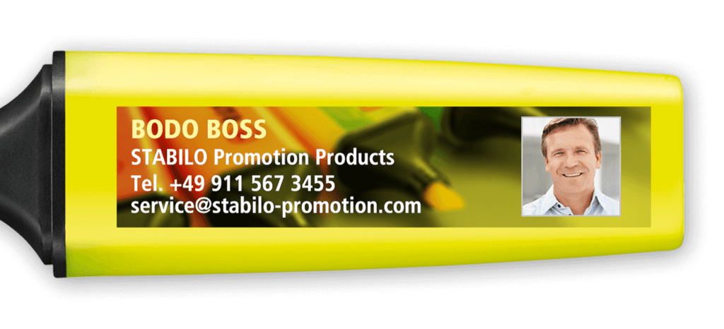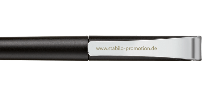 In digital printing, an image is created by spraying small drops of ink onto the pen. The ink is then dried immediately with the help of UV light. With 4c digital printing, photorealistic motifs can also be realised in small print runs. This enables us, for example, to print your personalised business card on a STABILO BOSS ORIGINAL.